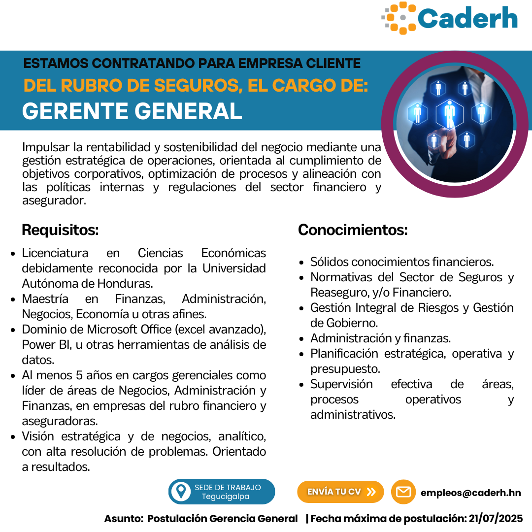 ¿Tienes experiencia en liderazgo estratégico y conocimientos en el sector financiero o asegurador? Estamos en búsqueda de un Gerente General para importante empresa cliente del rubro de seguros en Tegucigalpa.