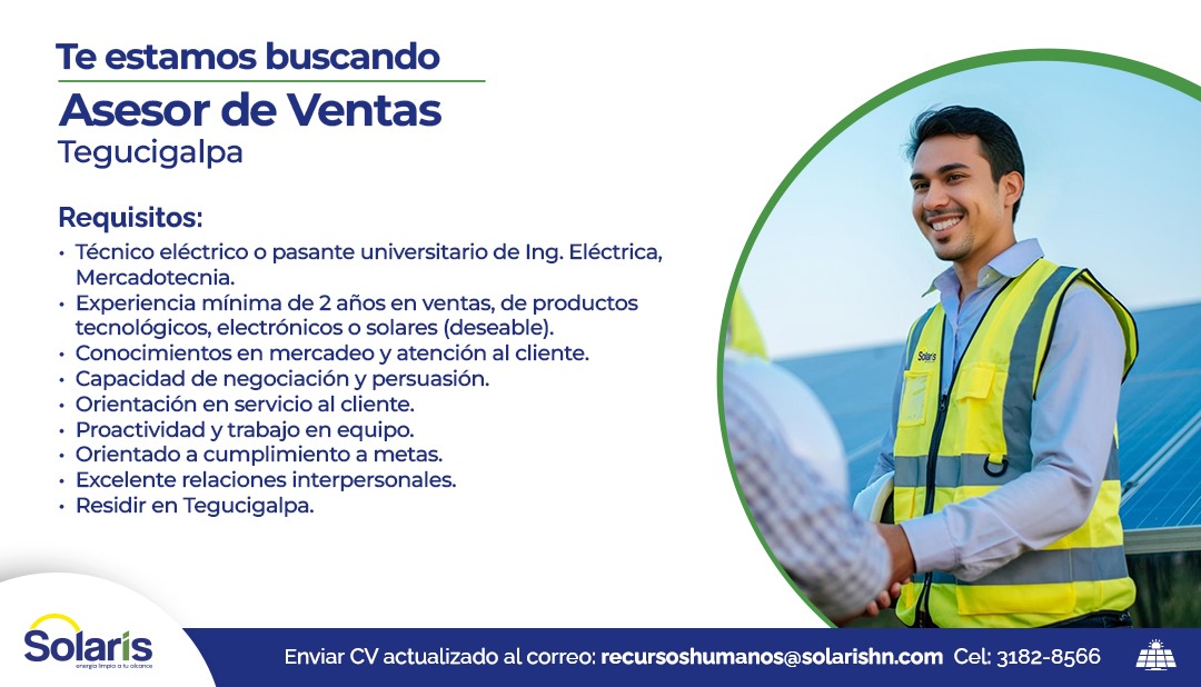 - Experiencia minima de 2 años en ventas, de productos tecnológicos, electrónicos o solares (deseable).