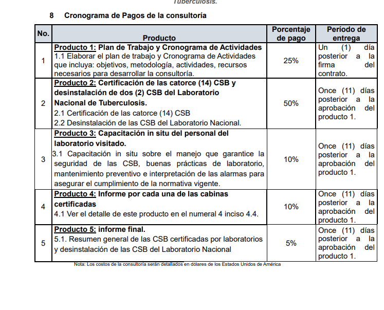 Nota: Los costos de la consultoría serán detallados en dólares de los Estados Unidos de América