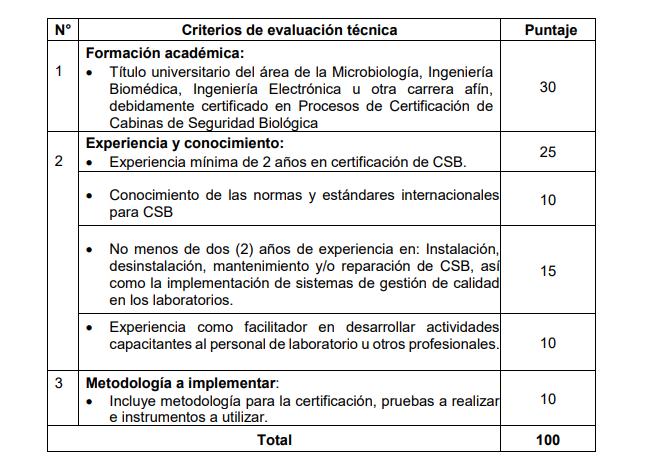 - Profesional universitario del área de la Microbiología, Ingeniería Biomédica,Ingeniería Electrónica u otra carrera afín, debidamente certificado en Procesos de Certificación de Cabinas de Seguridad Biológica.