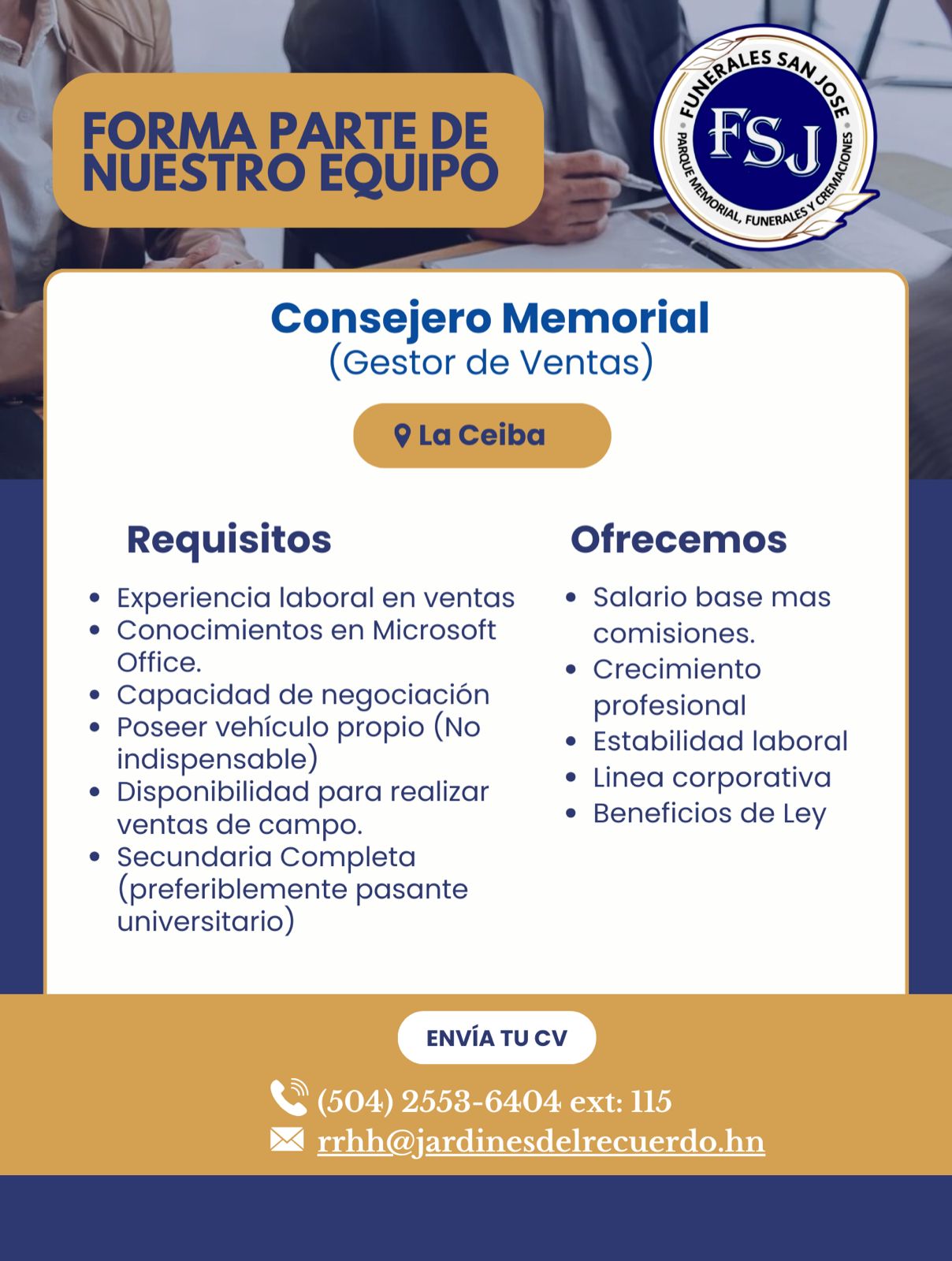 Forma parte de nuestro equipo Funerales San Jose, buscamos Consejero Memorial (Gestor de Ventas)