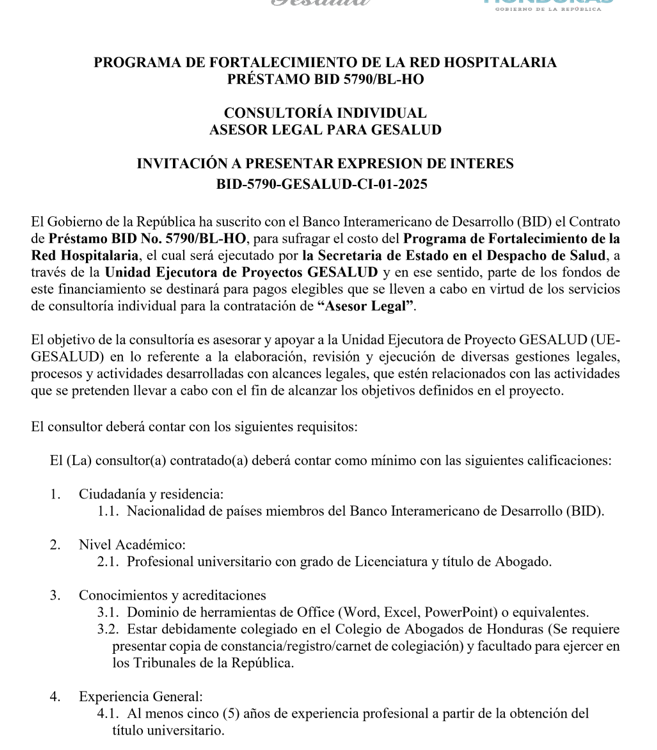 Proceso No. BID-5790-GESALUD-CI-XXX-2025 Asesor Legal para GESALUD