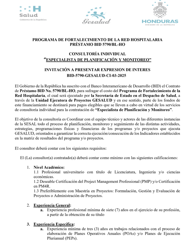 Aquellos interesados en participar podrán obtener los Términos de Referencia en la Página Oficial de ONCAE (http://www.honducompras.gob.hn) o solicitándolas a la dirección de correo electrónico abajo indicado. El plazo para presentar las Expresiones de Interés vence el martes veintidós (22) de abril de 2025 a las 05:00 p.m. (Hora Oficial de la República de Honduras).