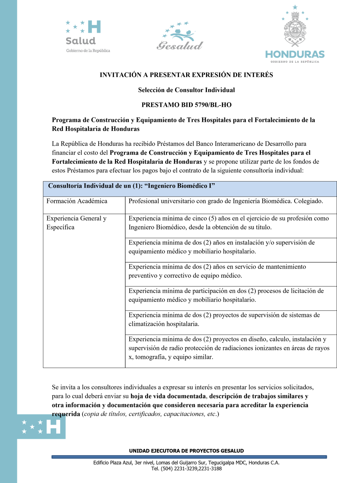 - Experiencia mínima de participación en dos (2) procesos de licitación de equipamiento médico y mobiliario hospitalario.