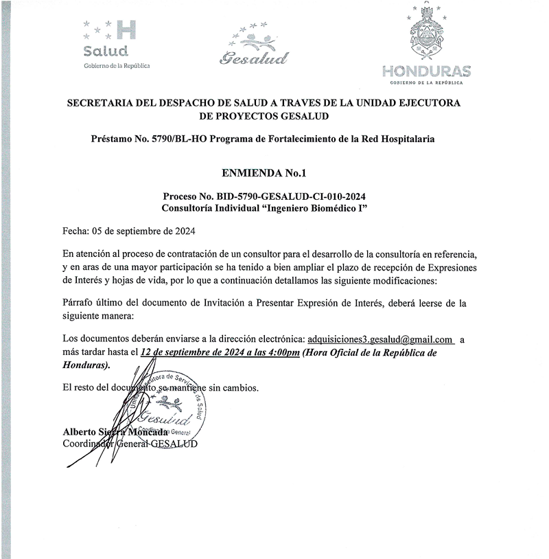 El 30 de noviembre del año 2023, se firmó el Contrato de Préstamo No. 5790/BL-HO, entre la República de Honduras y el Banco Interamericano de Desarrollo (BID), para desarrollar el Programa de Fortalecimiento de la Red Hospitalaria, con el objetivo de mejorar la efectividad y el acceso a los servicios especializados hospitalarios materno-infantiles, de atención a Lesiones de Causa Externa (LCE) y a complicaciones de Enfermedades No Transmisibles (ENT).