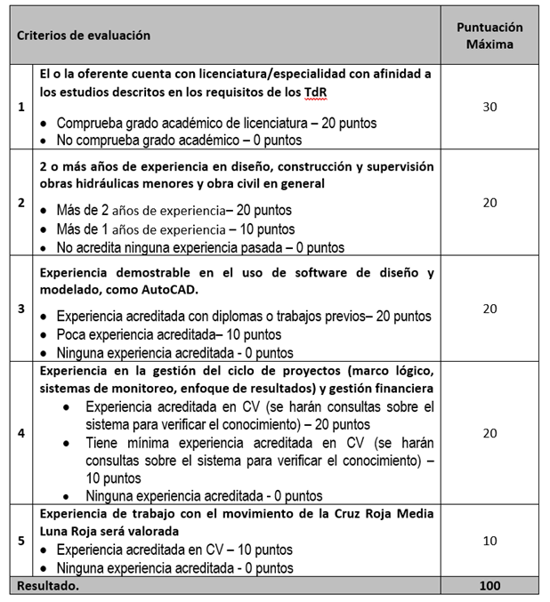 Ingeniero civil, con al menos 3 años de experiencia en obras hidráulicas menores, experiencia en construcción, manejo presupuesto, supervisar y dirigir personas tanto de la comunidad como contratados, Competencia en el uso de software de diseño y modelado, como AutoCAD.