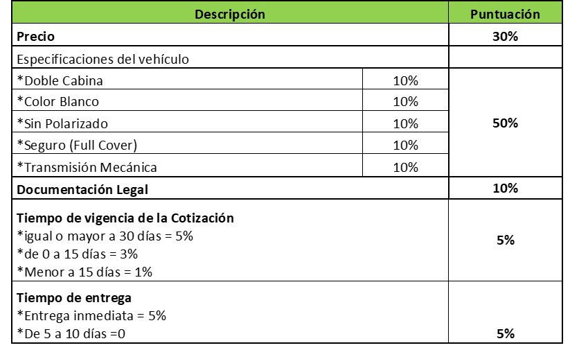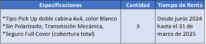Se solicita la renta de tres (3) vehículos que cumplan con las características descritas y que estén acordes con los criterios de compras requeridos para el cumplimiento de todas las instrucciones contenidas en el presente documento, ya que el incumplimiento de las mismas podrá descalificar al oferente durante el proceso de evaluación.
