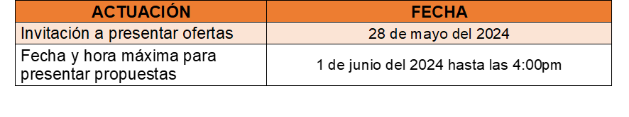 La oferta económica/cotización y los documentos solicitados, deberán ser entregados a más tardar el 01 de junio del 2024 a las 4:00 p.m., en la dirección mencionada en el inciso de APLICACIONES.