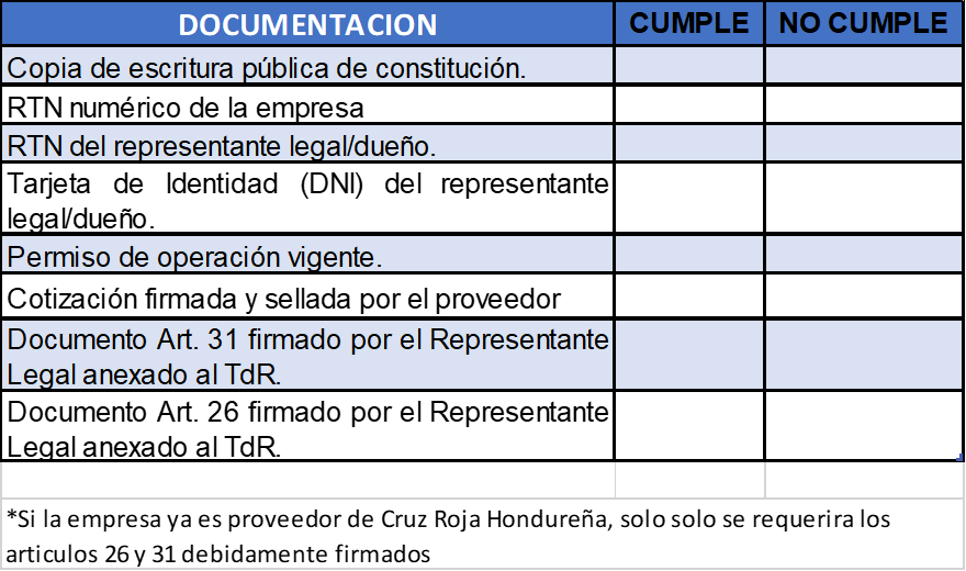 En el caso de los documentos solicitados en los incisos “a” hasta el “e” SI ya se es proveedor de Cruz Roja Hondureña, omitir él envió los mismos.