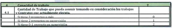 Dentro de las bases del documento de precalificación en la tabla de puntajes del apartado No. 4 - Capacidad de Trabajo, numeral 4.1 Cantidad de Trabajo que pueda asumir tonando en consideración los trabajos y contratos que actualmente ejecuta, el puntaje de evaluación menciona que si la empresa tiene 3 proyectos o más, el puntaje a obtener es cero (0); si la empresa tiene 2 proyectos en supervisión, el puntaje a obtener es uno (1); si tiene de 0-1 proyectos de supervisión, el porcentaje de a obtener es dos (2); ¿Es correcta esta calificación? ¿Se espera que la empresa consultora no tenga proyectos en ejecución para poder tener el puntaje total de este apartado en la precalificación?