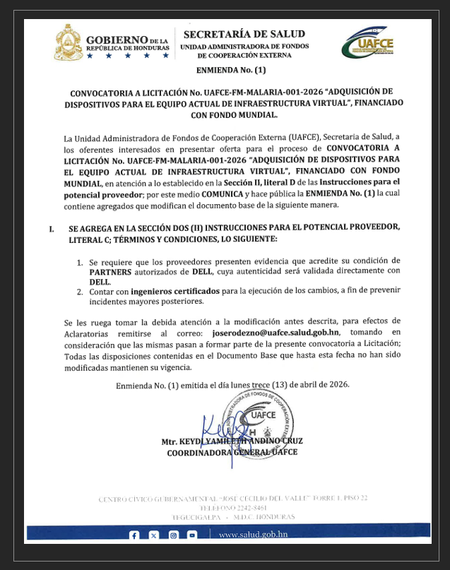 Nombre y número del Proceso: UAFCE-FM-MALARIA-001-2026 “Adquisición de Dispositivos para el Equipo actual de Infraestructura Virtual”