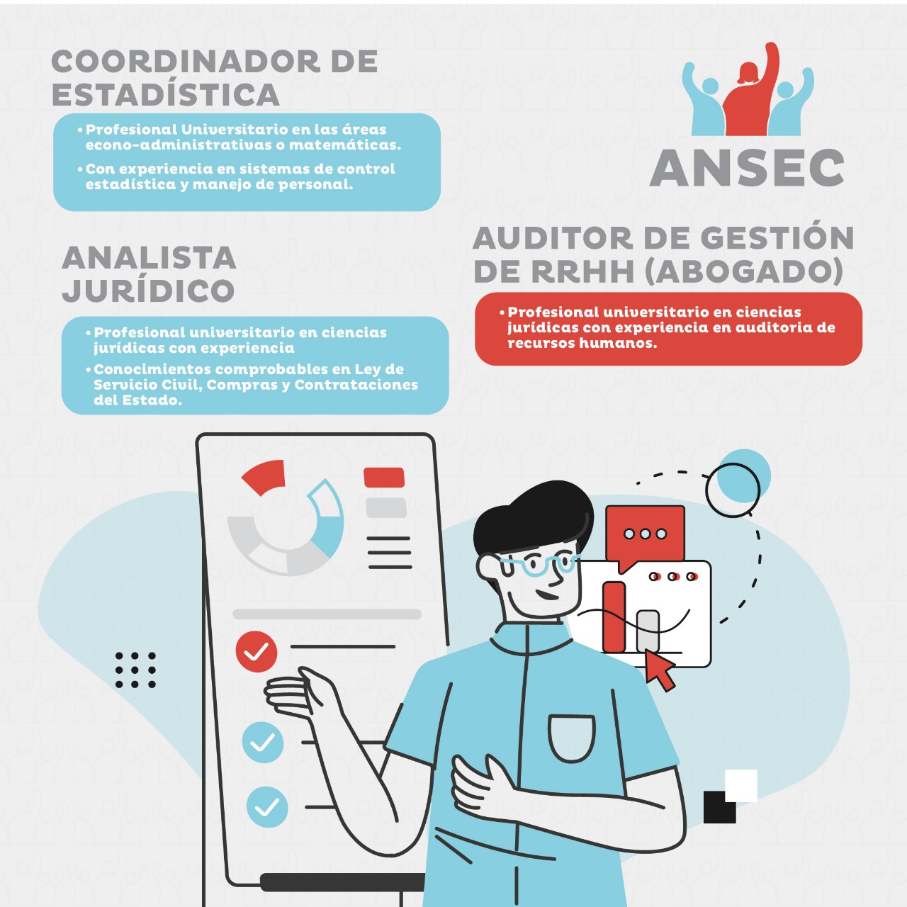 La Administración Nacional de Servicio Civil, enmarcándose en los Artículos 63 y 64 del Reglamento de la Ley de Servicio Civil, abre la convocatoria para las siguientes vacantes: