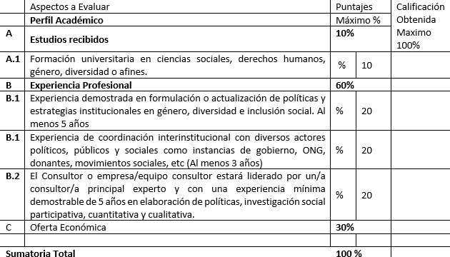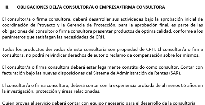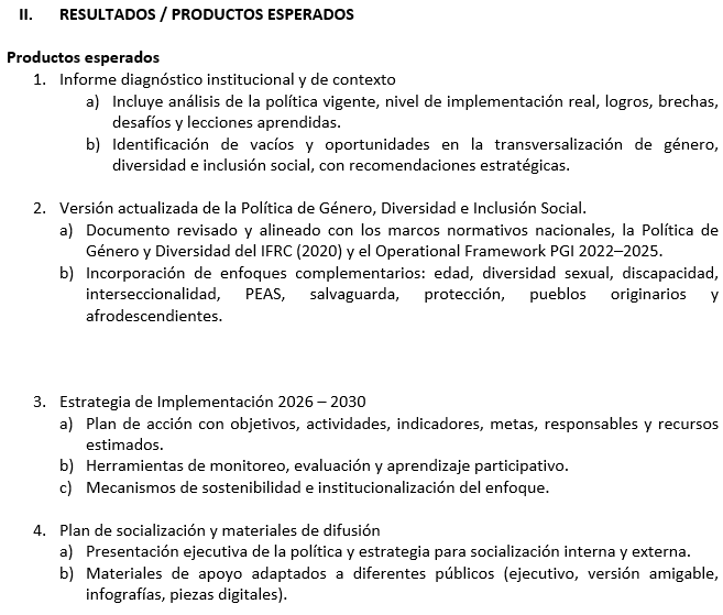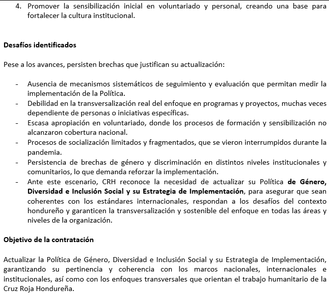 NOMBRE DE CONSULTORÍA: CONTRATACIÓN DE SERVICIOS PROFESIONALES PARA LA ACTUALIZACIÓN DE LA POLÍTICA DE GÉNERO, DIVERSIDAD E INCLUSIÓN SOCIAL DE LA CRUZ ROJA HONDUREÑA Y SU ESTRATEGIA DE IMPLEMENTACIÓN.