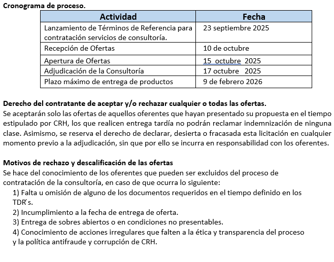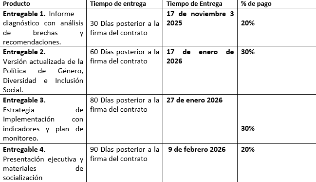 Nota: Los pagos solo se realizarán si los productos cuentan con aceptación de coordinación de proyecto y Gerencia de Protección de CRH.