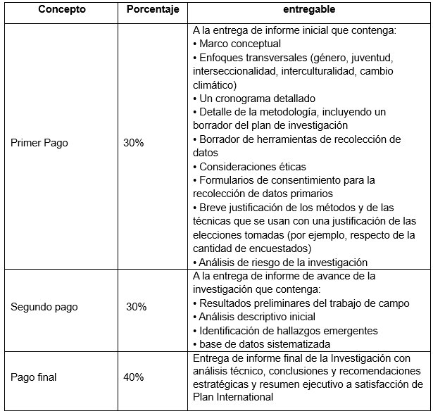 El plazo de ejecución es de 2 meses, comenzando el día de la firma del contrato, siguiendo el cronograma de trabajo consensuado entre Plan International y el/la consultora.