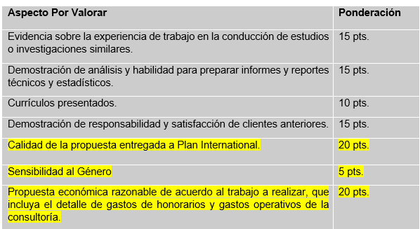Antes del vencimiento del período de validez de la Oferta, Plan International adjudicará el contrato a la consultora calificada y elegible que se estime responda a las exigencias de la Lista de Requisitos y Especificaciones Técnicas, y haya ofrecido el precio más bajo.