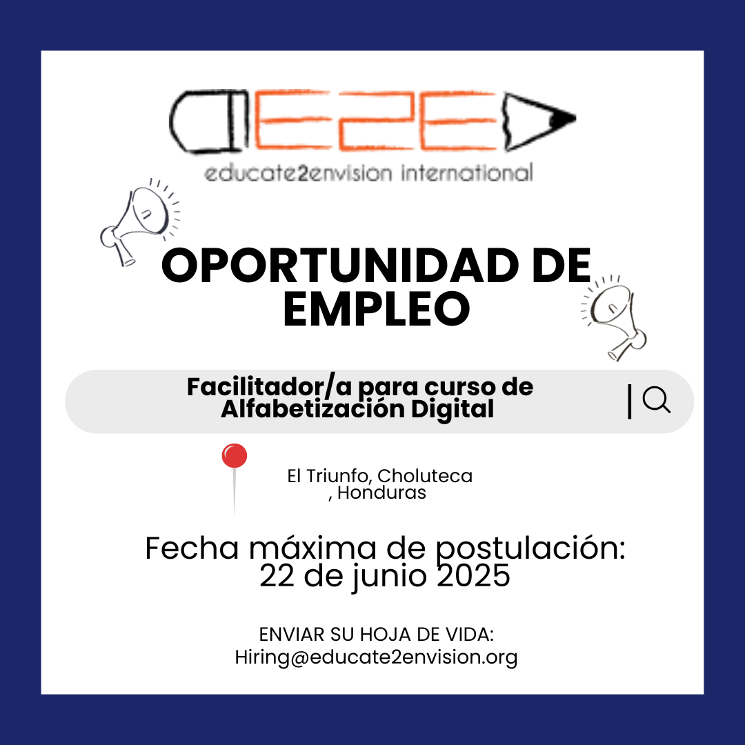 Educate2Envision (E2E) busca un/a facilitador/a comprometido/a, creativo/a y con aptitudes tecnológicas para liderar el curso de Informática dirigido a jóvenes de bachillerato del Centro de Innovación Juvenil NIDO, en El Triunfo, Choluteca.