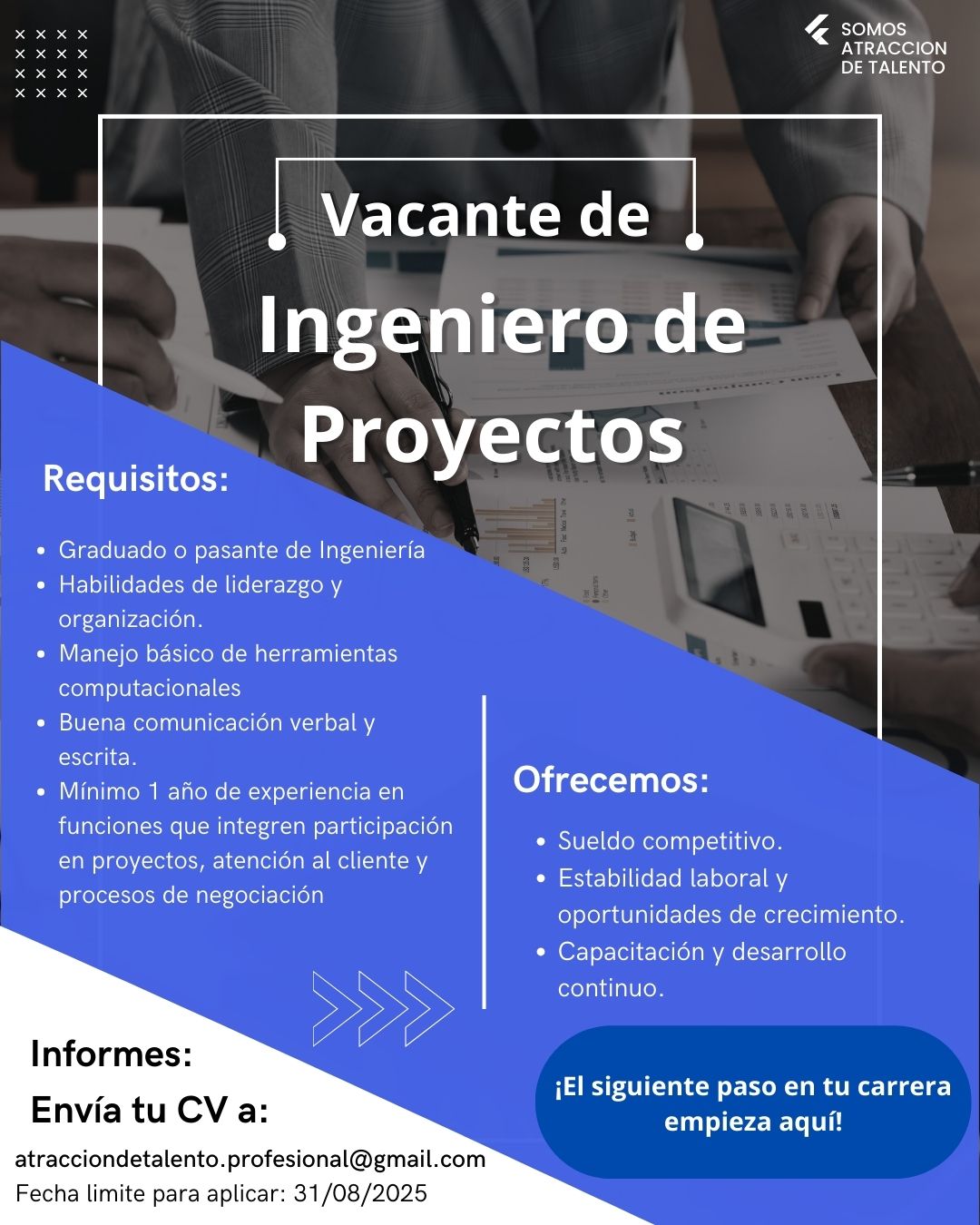 Enviar cv al correo[email protected] y colocar en asunto nombre de la vacante a la cual se postula.