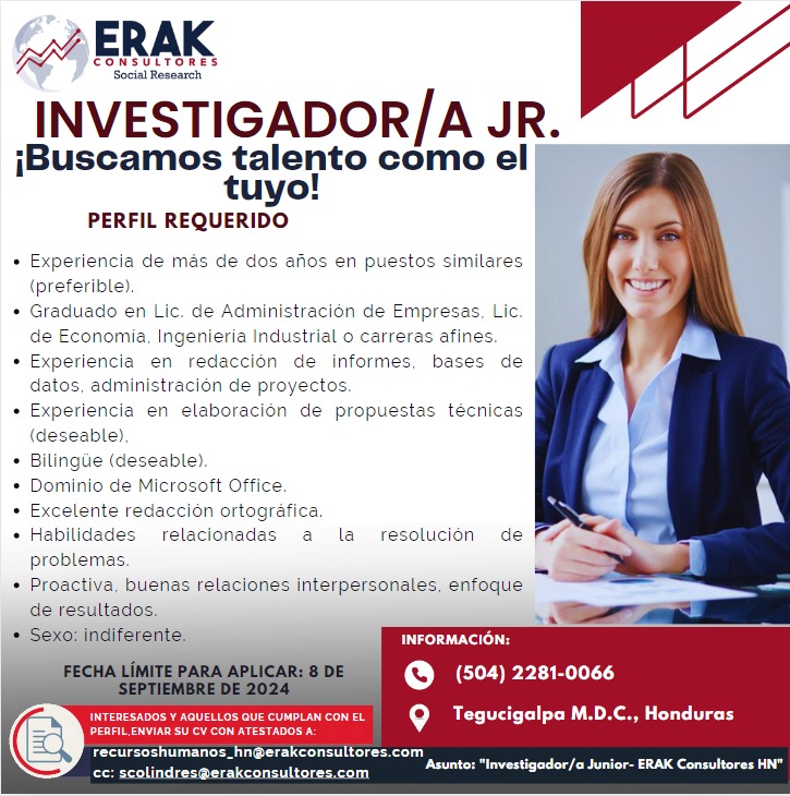 #Empleo #Investigaci贸n #InvestigadorJr. #InvestigadoraJr. #ERAKConsultores #ERAKConsultoresHonduras.
