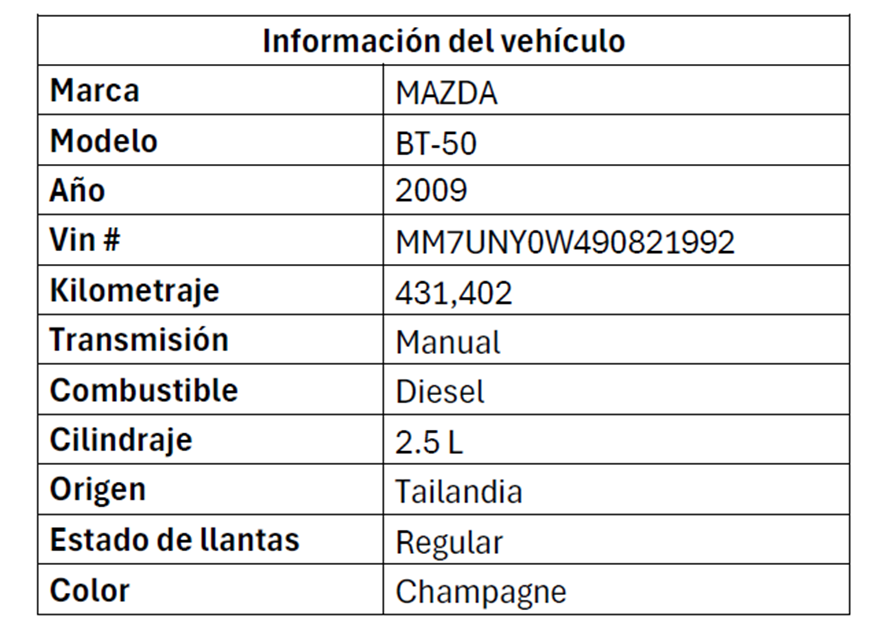 Se adjunta detalles sobre marca, modelo, año, VIN, carrocería, kilometraje, transmisión, combustible, cilindrada, origen, estado de llantas y color.