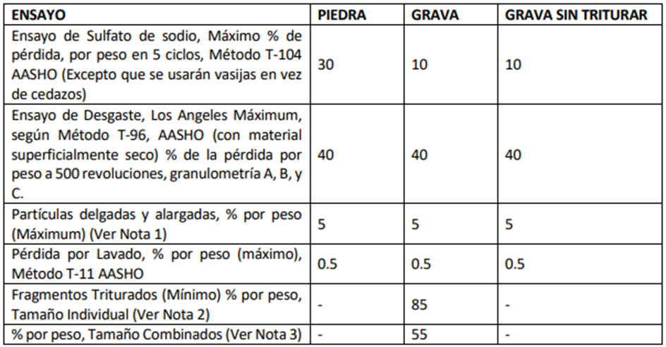 Todos los materiales preparados para producir agregado grueso reunirán los requisitos de calidad indicados en el Cuadro A, y se triturarán y cernirán cuando sea necesario, para satisfacer el análisis granulométrico para tamaño y granulometría para los distintos ítems de construcción. Todas las partículas deberán estar razonablemente libres de recubrimiento de arcilla, limo o polvo, y la cantidad máxima de materiales perjudiciales no deberá exceder los valores dados en el Cuadro B. El agregado grueso se producirá de los siguientes materiales: Piedra La piedra consistirá de roca tenaz durable, libre de textura pizarrosa o planos de clivaje.