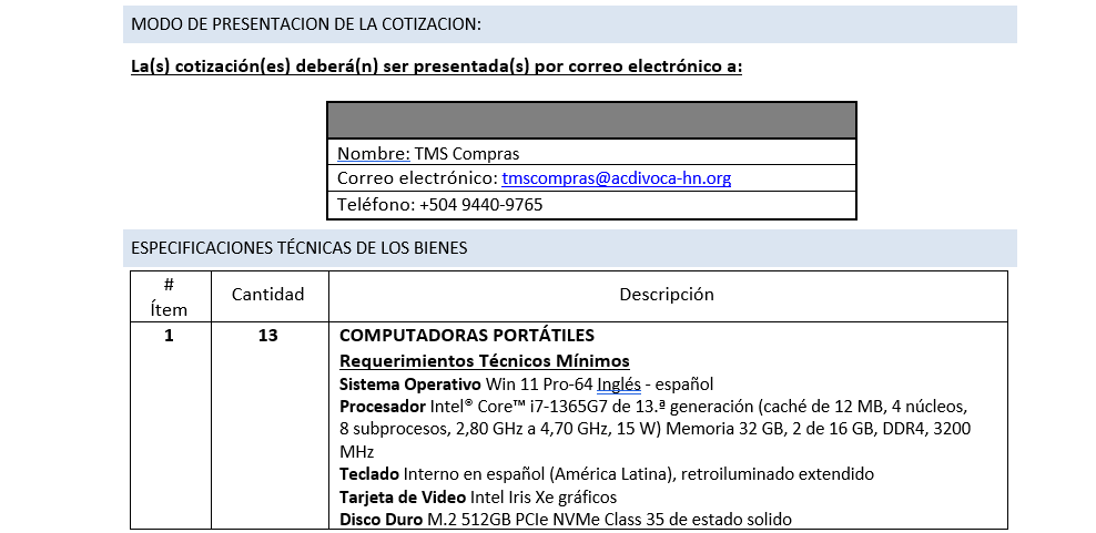 ACDI/VOCA a través del Proyecto TMS está buscando cotizaciones para los bienes listados en la tabla de especificaciones técnicas de este documento.