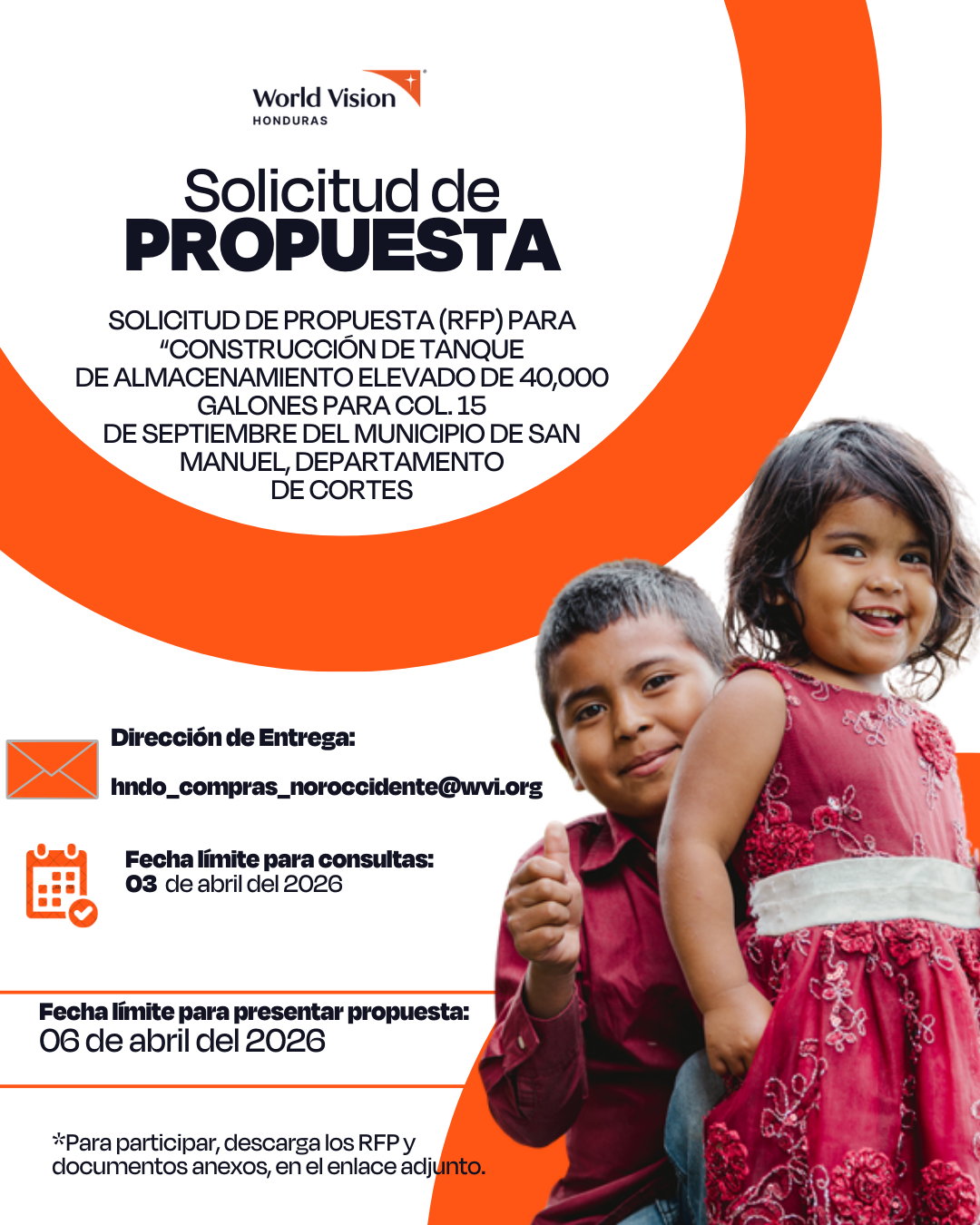 La propuesta deberá presentarse en idioma castellano, en el siguiente correo [email protected], a nombre de World Visión Honduras indicando en “Asunto” “CONTRUCCIÓN DE TANQUE DE ALMACENAMIENTO ELEVADO DE 40,000 GALONES PARA COL. 15 DE SEPTIEMBRE DEL MUNICIPIO DE SAN MANUEL, DEPARTAMENTO DE CORTES”.