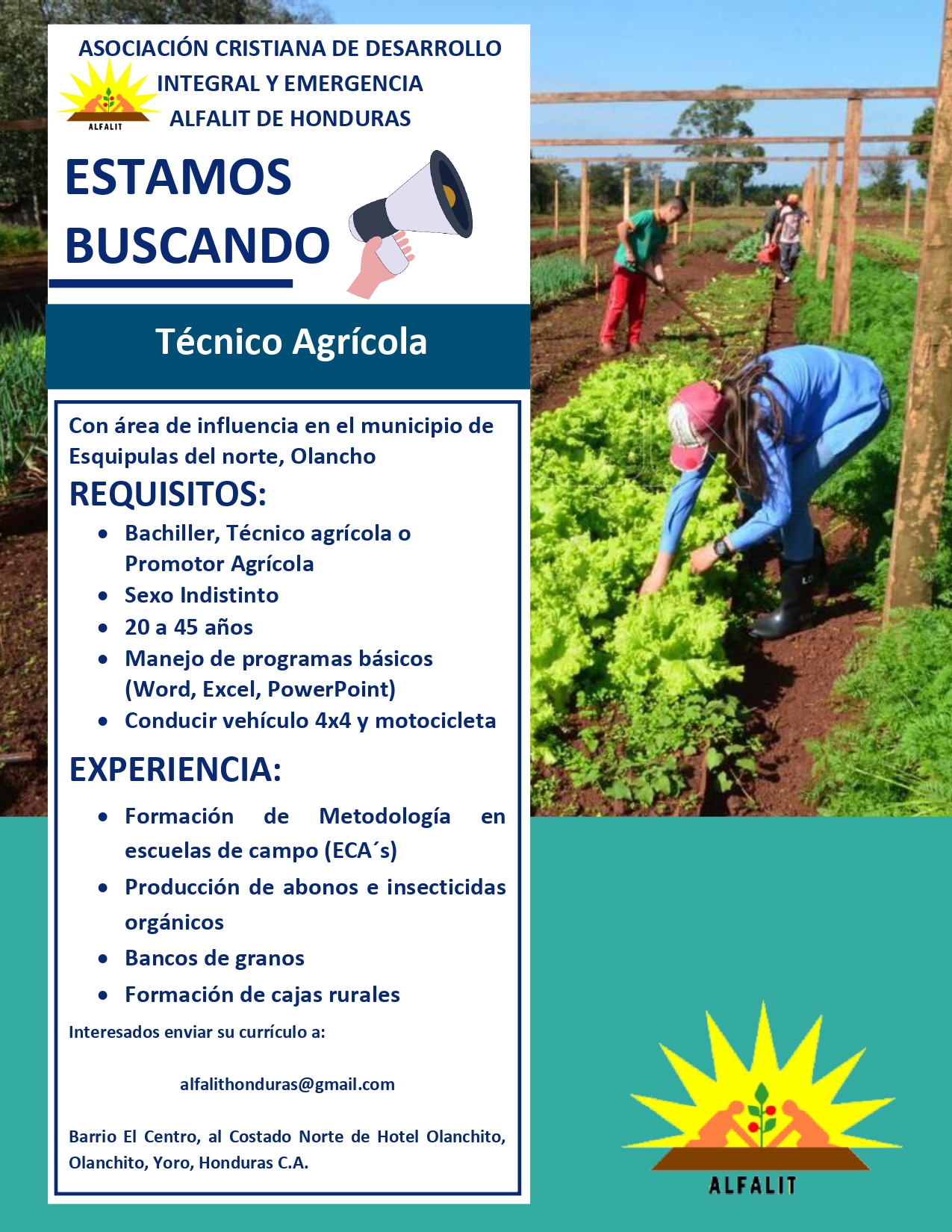 Profesional de las ciencias agrícolas y pecuarias, o carreras afines, a nivel medio/Universitario, con 2 años o mas de experiencia, Implementando lineamientos, estrategias y metodologías con enfoques SAN, facilitando el desarrollo de prácticas de producción agropecuaria y conexión a mercados sostenibles, mediante la coordinación con el equipo administrativo y técnico de ALFALIT/ACRIDE y las organizaciones locales de base .