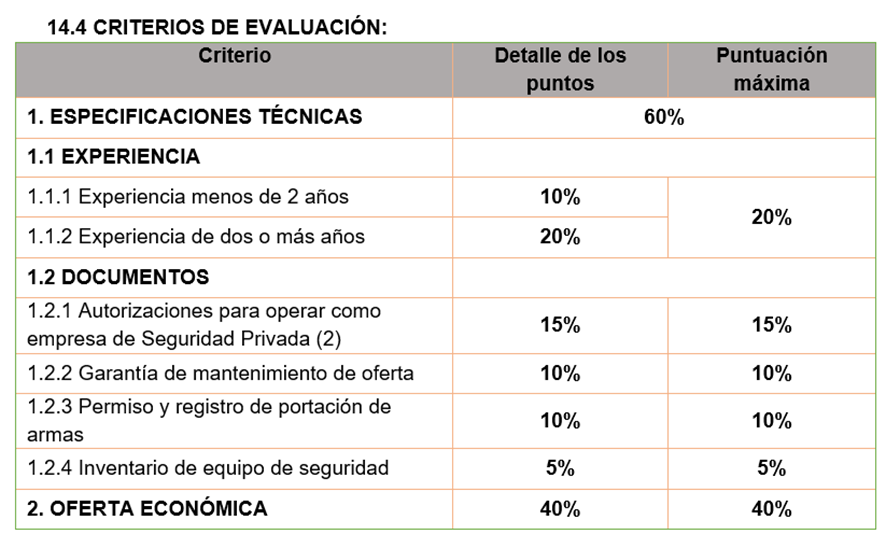 14.3 El porcentaje de evaluación será de 60/40, siendo el máximo puntaje de 60% el proveedor que cumpla con las especificaciones técnicas detalladas en la sección 2, documentos legales, permisos de operación y permiso de la Secretaría de Seguridad; el porcentaje de 40 se le brindará al proveedor que cumpla con la oferta más baja y dentro del presupuesto, si todas las ofertas cumplen con el presupuesto tendrán la misma puntuación, de lo contrario se aplicará el método basado en la proporcionalidad o de acuerdo a lo que el comité evaluador designe.
