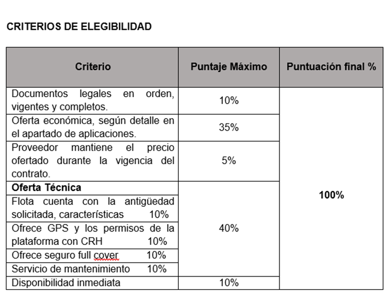 - Proporcionar a las empresas que participen en la convocatoria toda la información y las características técnicas y mecánicas de los vehículos requeridos, así como los equipos mínimos de seguridad requeridos, requisitos de los conductores y la cobertura necesaria que debe cumplir el seguro ante la ocurrencia de un accidente vehicular.