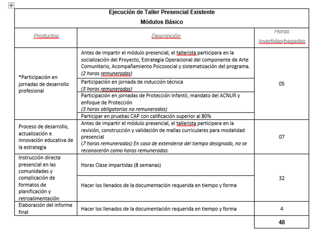 El/la instructor de Arte Comunitario llevará a cabo sus actividades de manera presencial, reportando y coordinando sus actividades directamente al Oficial de Proyecto asignado.