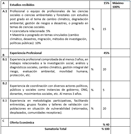 NOMBRE DE CONSULTORÍA: Contratación de servicios profesionales para Elaborar un diagnóstico situacional sobre el abordaje de poblaciones desplazadas por desastres, cambio climático y su respectivo marco de referencia