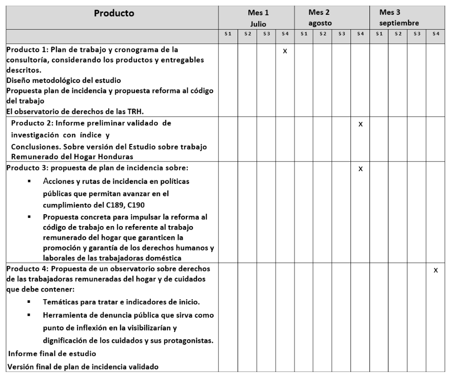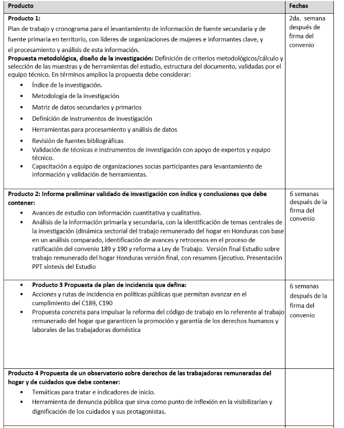 Realizar un Estudio sobre el estado de situación de las Trabajadoras Remuneradas del Hogar, considerando: a) el cumplimiento de los derechos humanos y laborales , con énfasis en seguridad social, jornadas laborales, contrato laboral, protección social y prevención violencia de género; b) identificación de acciones de incidencia para impulsar la ratificación del convenio y/o implementación de convenios 189 y 190 de la OIT; c) Propuesta de reforma al código laboral de Honduras, en el marco de políticas públicas locales o nacionales desde un enfoque intersectorial de género, clase y etnia y c) lineamientos para la implementación de un observatorio laboral de trabajadoras del hogar.