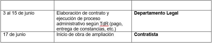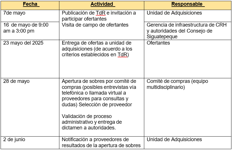 Agenda para desarrollo de TdR, publicación y selección de ofertantes Agenda de ejecución para desarrollar el proyecto: “SUMINISTRO DE MATERIALES Y MANO DE OBRA PARA LA CONSTRUCCIÓN DEL MURO PERIMETRAL Y CULMINACIÓN DEL SALÓN DE USOS DEL CONSEJO DE CRUZ ROJA HONDUREÑA EN SIGUATEPEQUE COMAYAGUA”