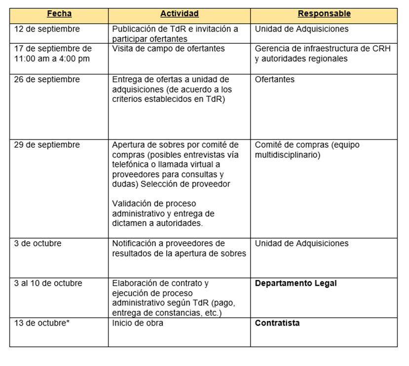 La visita de campo es obligatoria para poder ofertar, si el contratista considera que hay otras actividades que no fueron tomadas en cuenta en estos TDR, puede recomendar incluirlos como obra adicional dentro de este documento, colocándolas como obra adicional en su oferta la cual será analizada y validada por el equipo técnico de CRH.