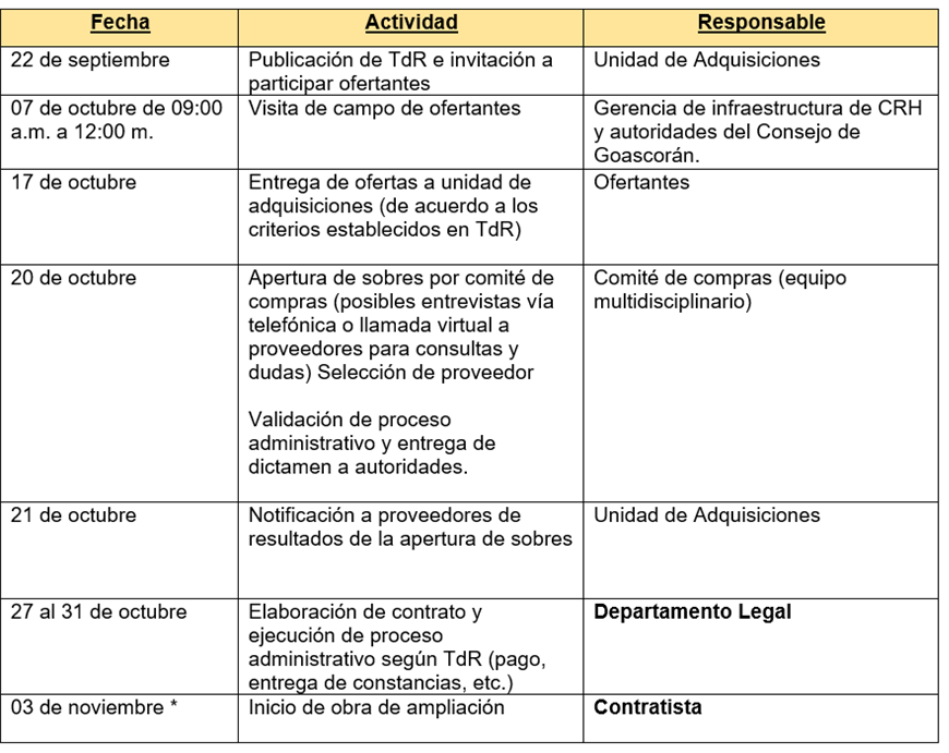Agenda de ejecución para desarrollar el proyecto: “SUMINISTRO DE MATERIALES Y MANO DE OBRA PARA LA CULMINACIÓN DEL SALÓN DE USOS DEL CONSEJO DE CRUZ ROJA HONDUREÑA EN GOASCORÁN, VALLE”