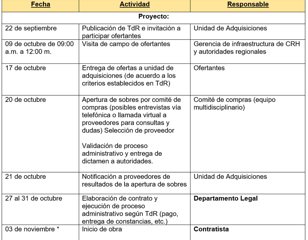 Nota: Cruz Roja Hondureña no hará ningún reembolso por costos en estimación y preparación de ofertas, todos los contratistas están en la libertad de presentar las ofertas y asumir los costos para la presentación de los documentos.