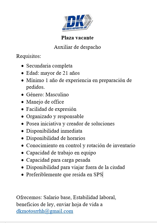 Buenas relaciones interpersonales, discreto, responsable, honesto, capaz de trabajar bajo presión con actitud de servicio.