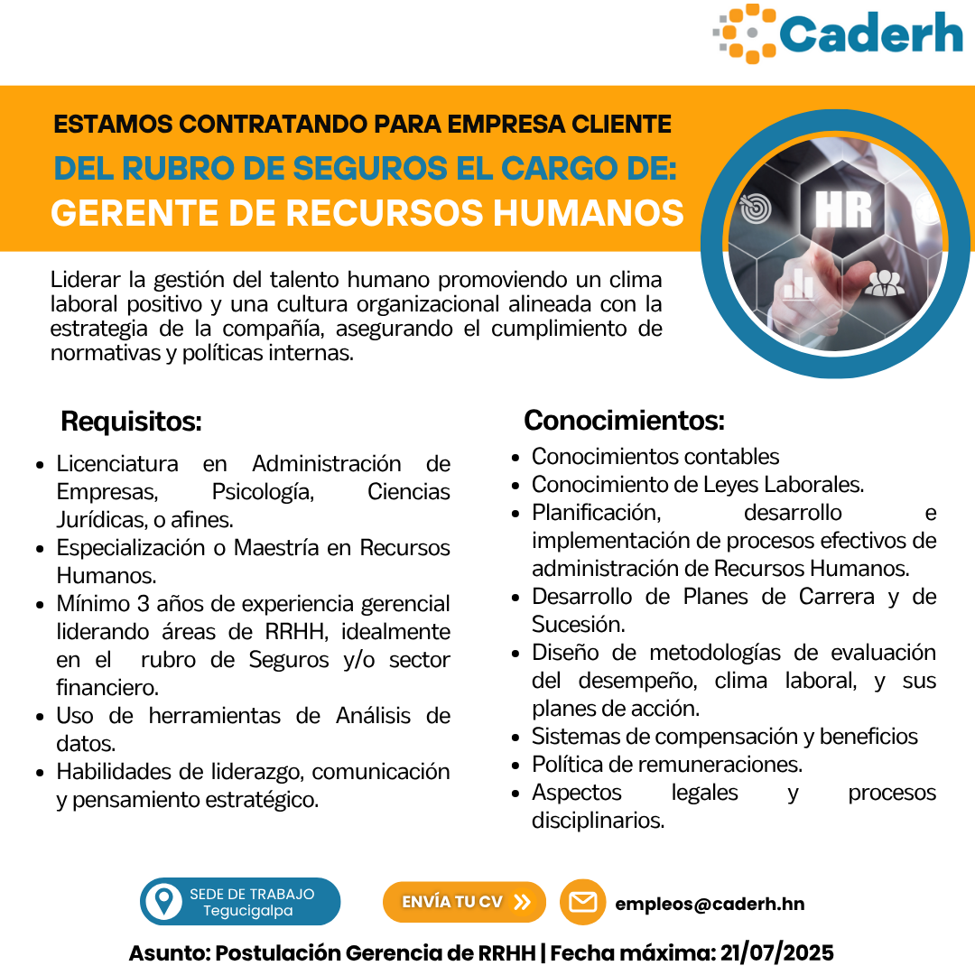 ¿Eres un líder en gestión de talento humano? Empresa cliente del sector seguros busca un(a) Gerente de Recursos Humanos para fortalecer su cultura organizacional en Tegucigalpa.