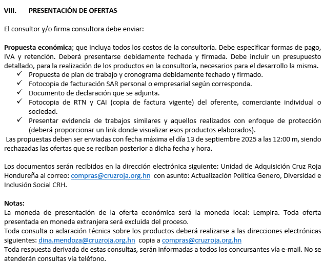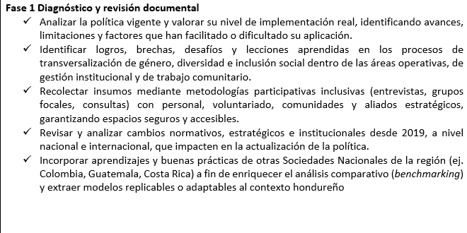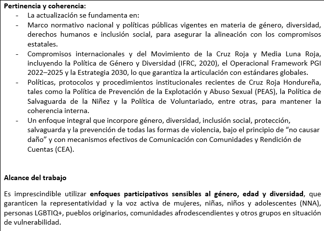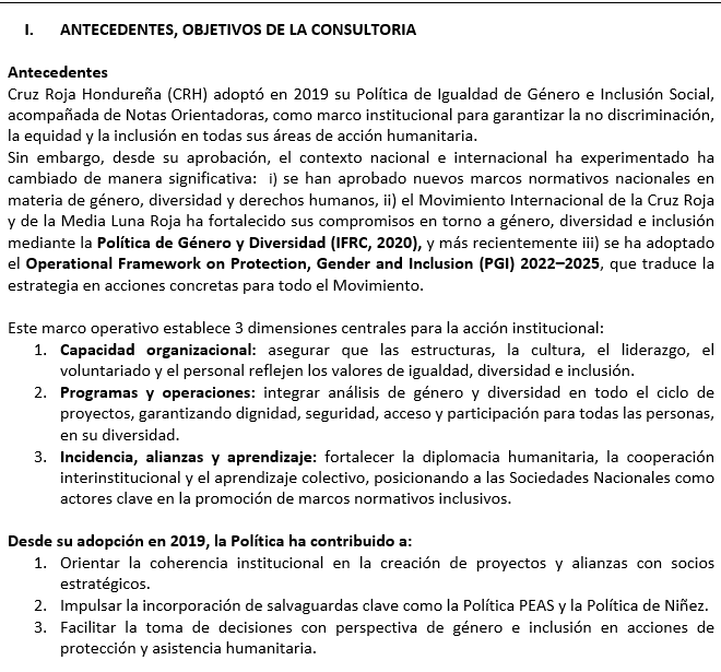 NOMBRE DE CONSULTORÍA: CONTRATACIÓN DE SERVICIOS PROFESIONALES PARA LA ACTUALIZACIÓN DE LA POLÍTICA DE GÉNERO, DIVERSIDAD E INCLUSIÓN SOCIAL DE LA CRUZ ROJA HONDUREÑA Y SU ESTRATEGIA DE IMPLEMENTACIÓN.
