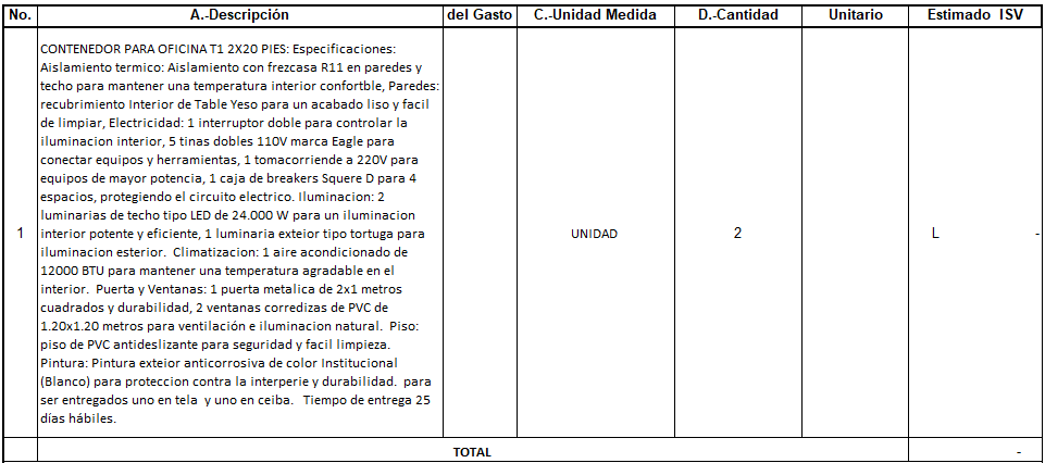 En seguimiento a las acciones ejecutados con Fondos del Proyecto RECOVER y enmarcada en actividades de implementación de los planes de protección y equipo requerido para el monitoreo de contratos de Usufructo, se solicita iniciar con el proceso de Compra de dos (2) contenedores conforme a las especificaciones técnicas detalladas en los documentos adjuntos.