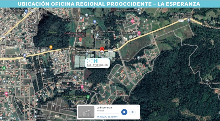Dirección: Proyecto PRO-OCCIDENTE crédito (4936/BL-HO, 4940/BL-HO), financiado a través del Banco Interamericano de Desarrollo (BID), Oficinas del Proyecto Pro Occidente, Km 1 salida a Marcala en las Instalaciones de SAG-DICTA, La Esperanza, Intibucá, Honduras, C.A. y/o Oficinas del Proyecto Pro Occidente ubicadas en Boulevard Morazán, Colonia San Carlos, Edificio Los Castaños, 5to Piso, Tegucigalpa, Honduras, M.D.C.