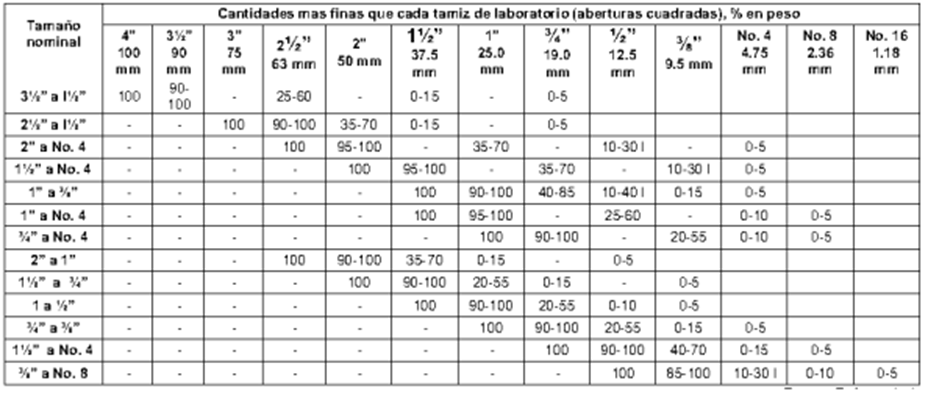 El agregado grueso para el concreto consistirá de piedra triturada sin poros, o grava de formas cúbicas y no alargadas (laja), y estará graduada de acuerdo con ASTM C33. El agregado de piedra caliza solamente será aceptable si es de una variedad cristalina dura y con una absorción menor que el 4%. El agregado grueso para todas las clases de concreto estará de acuerdo con la tabla 2 de ASTM C33. Los tamaños máximos y mínimos nominales del agregado grueso son 40 mm. y 20 mm., respectivamente. El tamaño máximo del agregado grueso será, en general, tan grande como sea posible, pero en ningún caso mayor que: Un cuarto del espesor mínimo del componente, ó 6 mm menos que la distancia entre las barras de refuerzo o aquélla de la cubierta del concreto sobre el refuerzo, en el entendido que el concreto puede ser colocado sin dificultades incluso en todos los lugares que circunda el refuerzo y pueda llenar las esquinas del molde. De suministrarse diferentes tamaños de agregado grueso en forma separada, se controlará la graduación del agregado grueso mediante la obtención de agregados de 40 mm de tamaño máximo nominal.