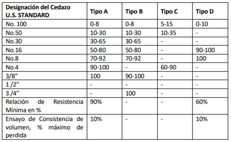 Todos los materiales preparados para producir agregado grueso reunirán los requisitos de calidad indicados en el Cuadro A, y se triturarán y cernirán cuando sea necesario, para satisfacer el análisis granulométrico para tamaño y granulometría para los distintos ítems de construcción. Todas las partículas deberán estar razonablemente libres de recubrimiento de arcilla, limo o polvo, y la cantidad máxima de materiales perjudiciales no deberá exceder los valores dados en el Cuadro B. El agregado grueso se producirá de los siguientes materiales: Piedra La piedra consistirá de roca tenaz durable, libre de textura pizarrosa o planos de clivaje.