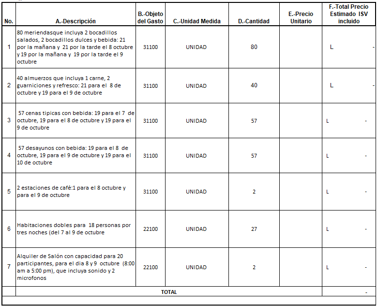 Por este medio solicito: alimentación, salón con sonido, micrófonos y habitaciones para el Taller de Capacitación de alerta del 7 al 10 de octubre a realizarse en la ciudad de La Ceiba, Atlántida.