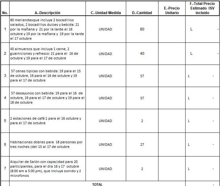 Por este medio solicito: alimentación, salón con sonido, micrófonos y habitaciones para el Taller de Capacitación de alerta del 15 a 18 de octubre a realizarse en la ciudad de La Ceiba, Atlántida.