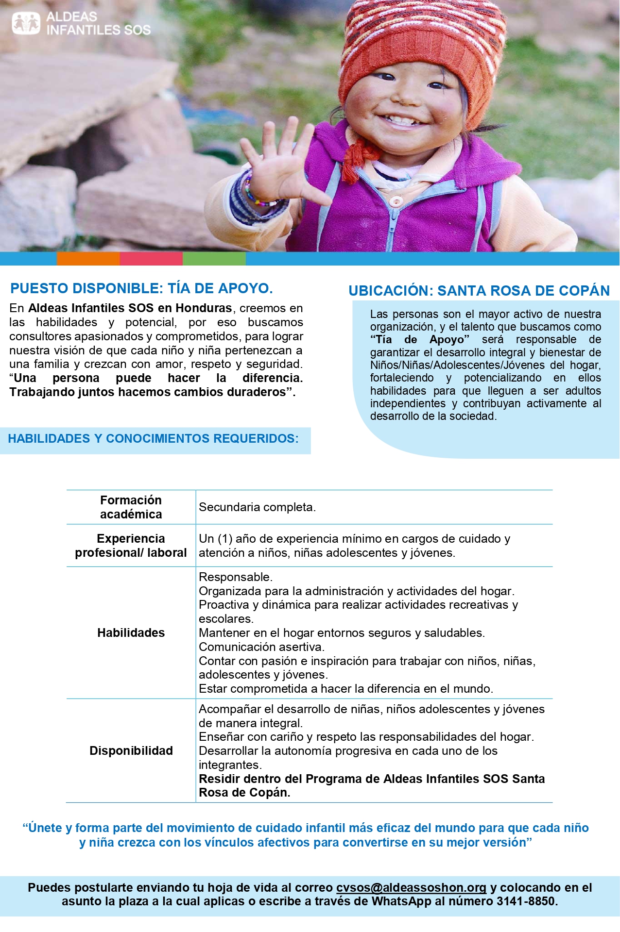 - Requisito obligatorio: Residir/vivir dentro del Programa de Aldeas Infantiles SOS - Santa Rosa de Copán.