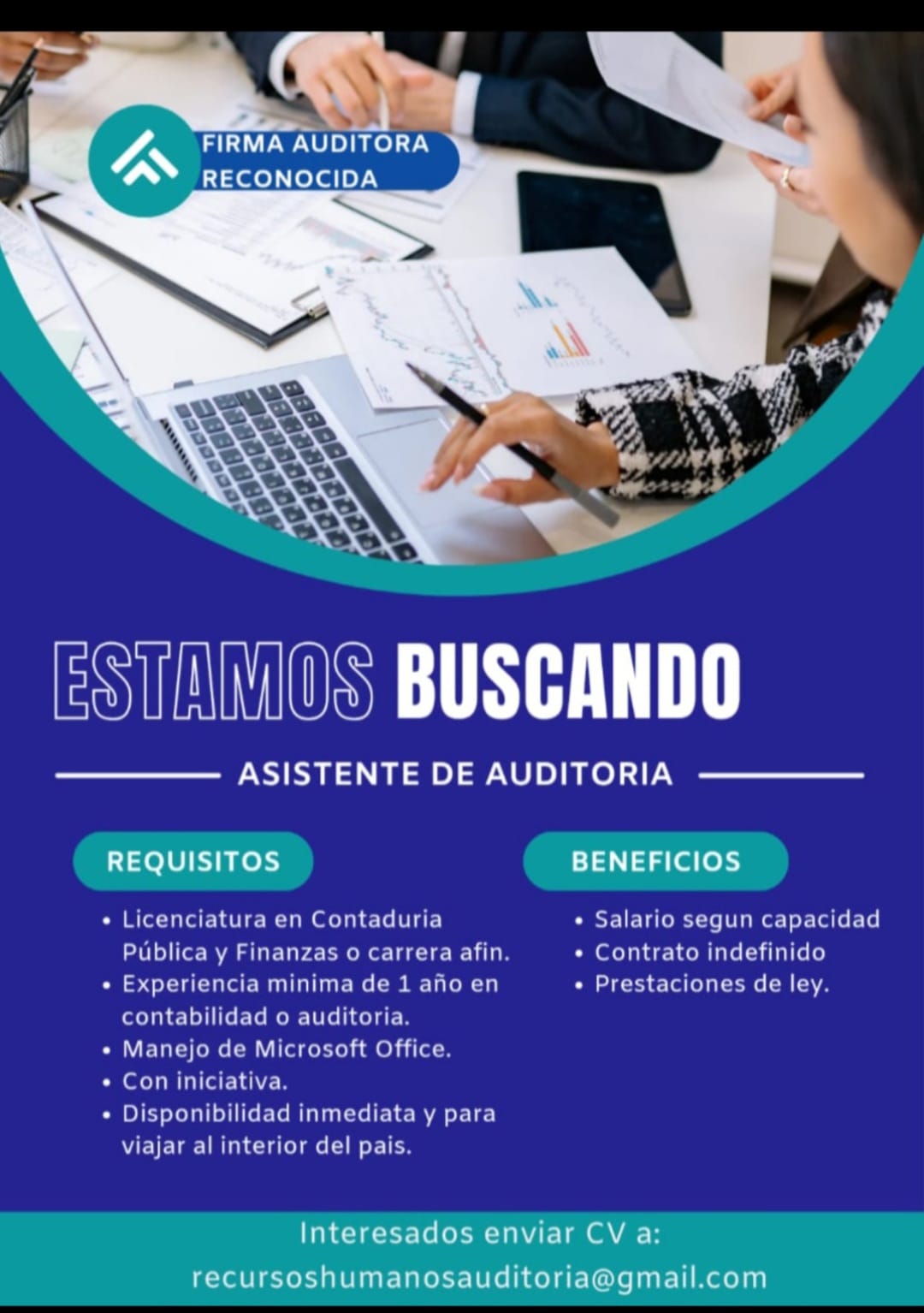 Estamos Contratando Asistentes de Auditoria, mínimo un año de experiencia, ambos sexos,que tengan el deseo de trabajar.