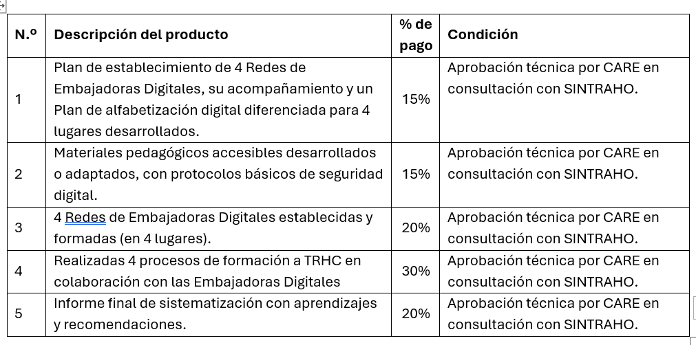 La consultoría será coordinada y supervisada por el equipo del proyecto Hora de Cuidar de CARE Honduras, en articulación con SINTRAHO.