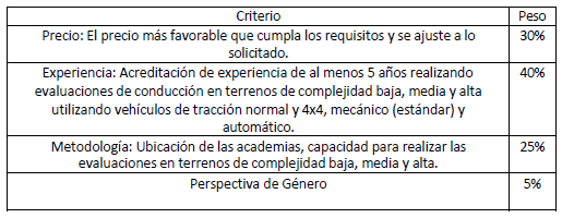- Acreditación de experiencia de al menos 5 años realizando evaluaciones de conducción en terrenos de complejidad baja, media y alta utilizando vehículos mecánicos (estándar) y automático, de tracción normal y 4x4.